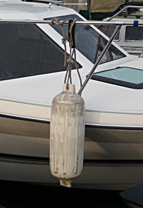 I borrowed my neighbors boat to show a better form. This has the bitter end of the fender whip tied to the railing with a Spar Hitch so if the Quick Adjuster comes loose the fender will still be attached to the boat. Not able to be seen in the picture is the stiffness of the fender whip which makes tying a knot in the whip difficult. Fender whips need to be changed when the line becomes too stiff to easily tie a knot in.