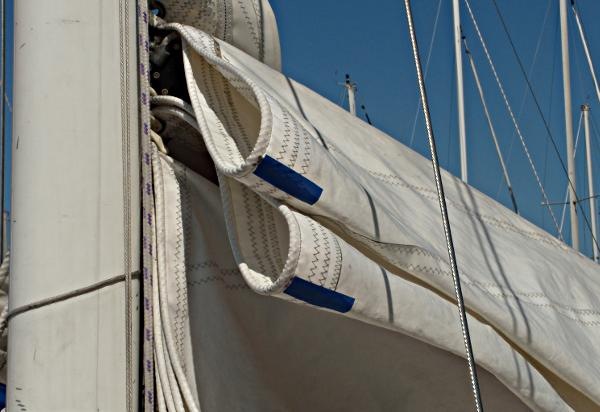 The luff of the sail has the same marks placed on alternating sides and when the sail comes down the marks are pulled to the outside which alternate the folds, as the folds are alternated the leach marks are placed on the top of the boom.