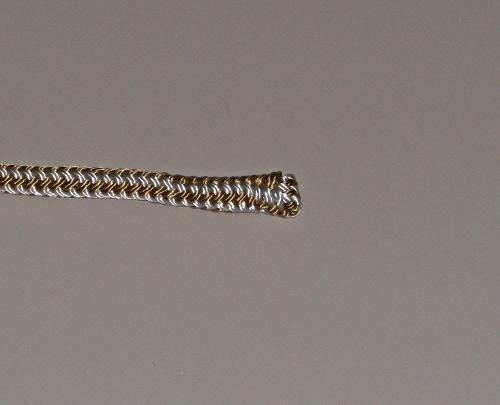 Getting ready to bury the bitter end inside itself. Bury a couple of inches of the cover in itself. Not a critical number but there needs to be enough cover inside for the whipping to work. The fid with the black handle is a Point Hudson Fid, the other one is a Splicing Wand, both by Brian Toss and available at most boating supply stores. Use any method that works for you, a couple of times I put masking tape on the end and sort of worried the end into the cover. |