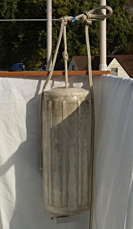 Here is the completed Fender Whip with the fender hanging on my fake lifeline on my balcony. Note the stopper knot tied above the fender, to keep the Fender Whip from falling down through the fender when the fender is stored. The line on the right is the original double braid showing the knot is bulkier and harder to handle than in the line with the core removed. Both knots are slippery Spar Hitches. |
