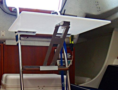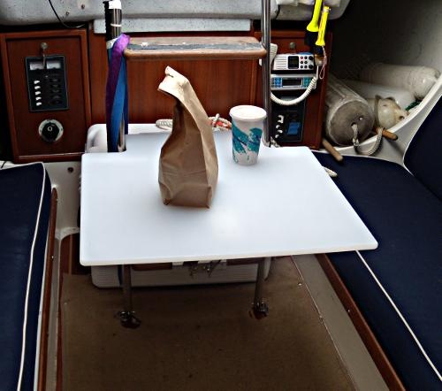 Miscellaneous: The plastic is heavier than wood and the table would not float if dropped overboard. The table is a single piece so it is a bit awkward to handle at times. A bit of sanding was all it took to finish the surface of the table, no varnish or epoxy. Someday if I get real ambitious I might make a new table top out of fiberglass with a balsa or other lighter core.