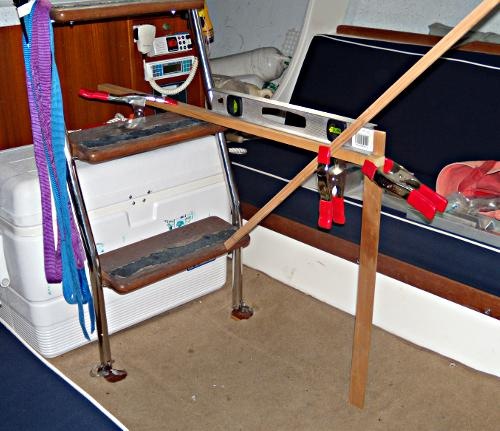 I did a mockup of the table top and the support leg. Yes that is a level being used on the boat. I wanted the table level forward to aft to prevent things from rolling off. I also made a cardboard pattern of the tabletop to check the fit with the ladder and to see how the table would be to work around. |