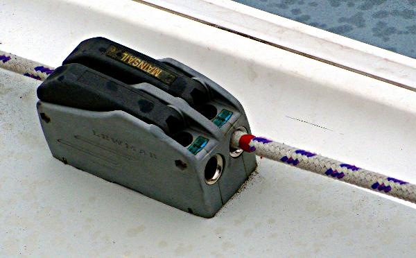 The mark shown in the first picture is the main halyard set point when the main halyard is used as a topping lift. At the end of the day we just pull the mark through the clutch as shown and the boom is sitting level, then pull the main sheet tight locking the boom in place for storing while at the dock. Quick and easy, no guessing no fussing with the setting and repeatable.