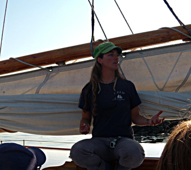 While the crew moved the Schooner Adventuress from the dock we got a history lecture about the 100 year old lady. By moving us all over to the side away from the dock and requiring us to sit on the deck, the sight lines were cleared for the captain & crew and we were out of the way of the line handlers.
