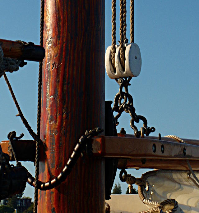 Even at 4:1 mechanical advantage the main halyard took many hands to raise the main sail