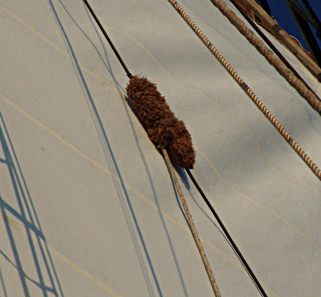 Baggywrinkle on the Schooner Adventuress. Baggywrinkle is a traditional anti-chafing method.