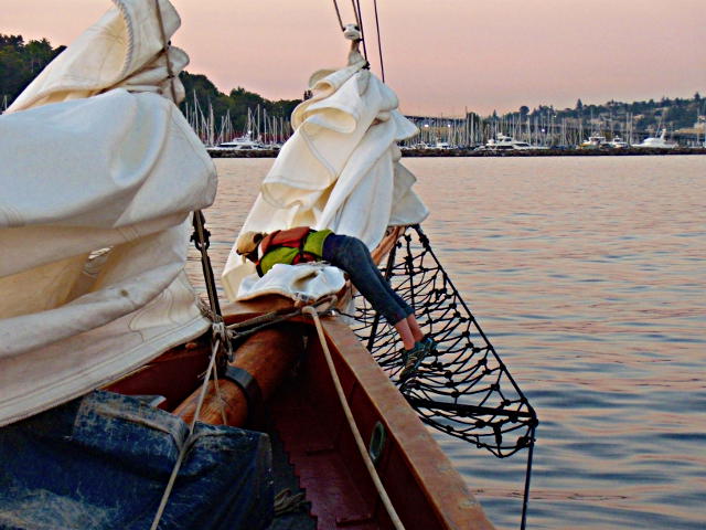 One of the crew on the Schooner Adventuress tying the sail to the bow sprit.