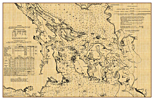 The original chart had a white background.  The background was changed to transparent and the the chart laid over a papyrus paper background and the brown border added.  This was a difficult chart to convert.  The detail in Seattle resulted in very large file sizes.  The image needed to be scaled down severely to be manageable.  The first PNG file export gave a 134MB file that took almost 1/2 hour of processing time.  Scaling the image from 16,300 pixels wide to 4,950 pixels wide with some cropping of the original image still gave a 12 MB PNG file, that was manageable as a transparent overlay.