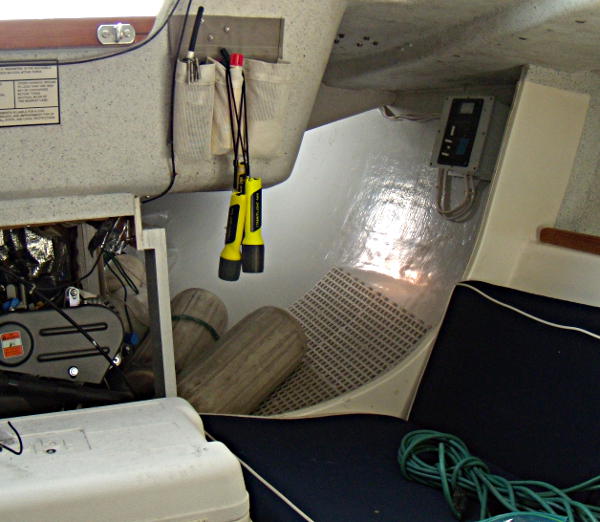 New electrical panel showing improved engine and aft quarter access. The entire area below the flashlights was blocked, making access to the fender and anchor storage area difficult, as well as making engine access very difficult.