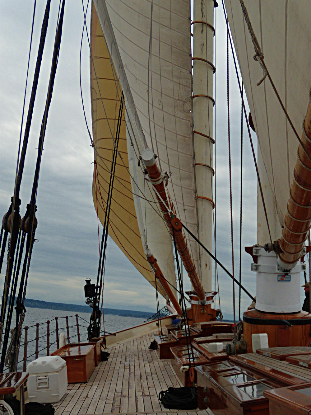 All the sails pulling, about 9 knots reaching a bit in Elliot Bay toward Bainbridge Island