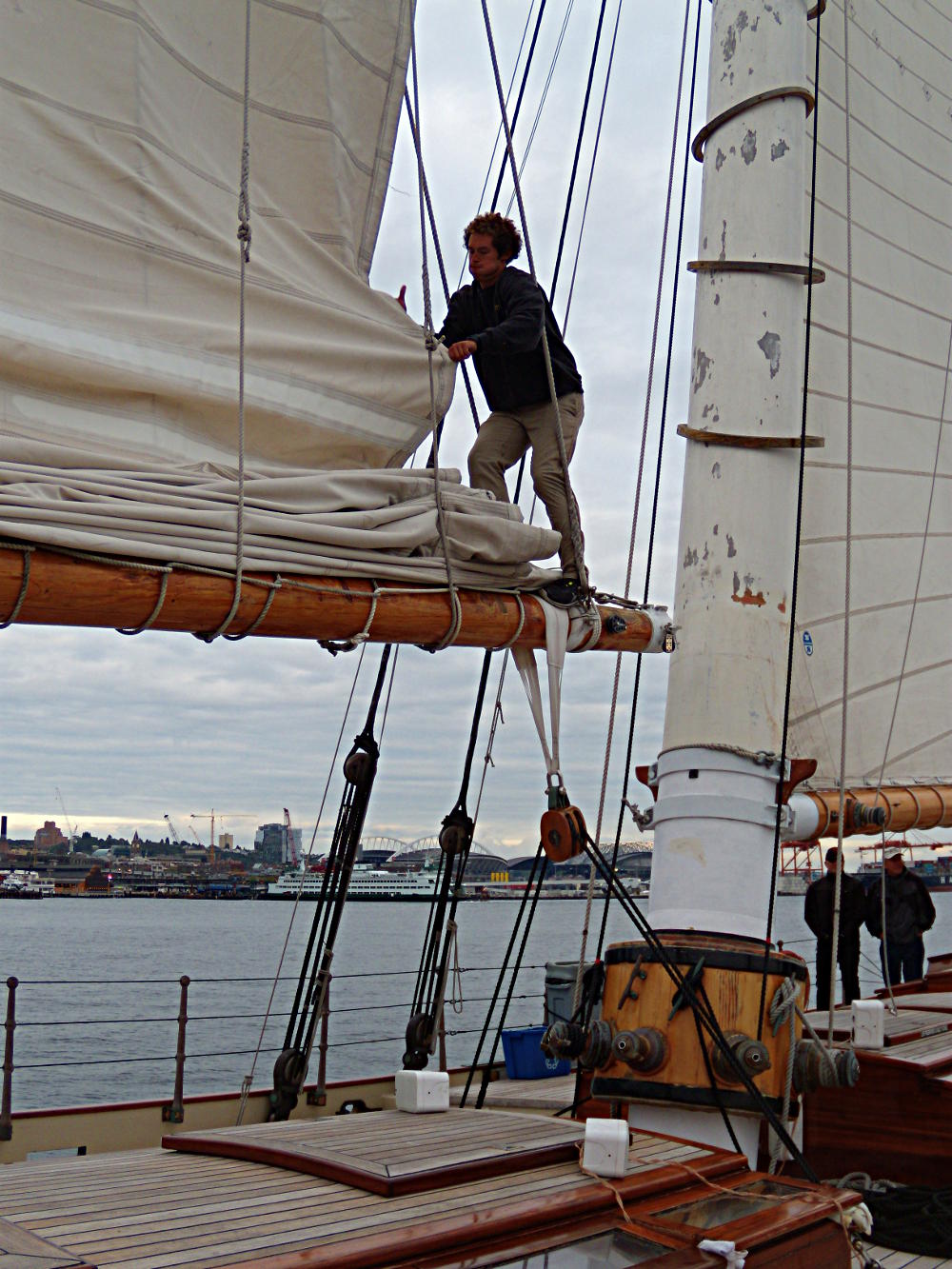 Dropping the sails on a Tall Ship like the America is a bit of a job, here a crew member climbs up onto the boom to control the leach of the sail and flake it as the sail comes down