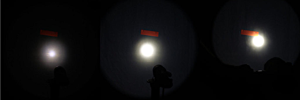 Flashlight Beam Shots, Left to right: Streamlight 4AA Propolymer LUX LED, Streamlight ProPolymax 4AA LED Flashlight, Streamlight Waypoint LED Pistol Grip Flashlight. (Shutter speed 1/100 second all shots)