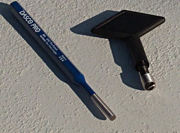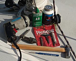 Supplies for the repair, 3/8 inch drill motor, T Handle Tap Wrench, small hammer, small pin punch, HeliCoil Thread Repair Kit (HeliCoil is the trademark and one of the early if not the first with a thread repair kit, others now sell similar repair kits, I have chosen to stick with the original) (the kits come with a drill bit, special tap, coil inserts and an insertion tool), Thread cutting lubricant and Silicone Paste to help cut down on corrosion between the threaded insert, mast and fastener, see also the “Secret Sauce“, Teff-Gel is very popular for preventing corrosion as are several other items, remember do not assemble the fasteners without some sort of protection or corrosion can occur and things can fail prematurely.
