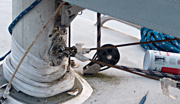 I decided to use some AmSteel line from Samson Rope (12 strand single braid non-rotational line out of Dyneema, similar in strength to St. Steel but lighter and no rough edges) and put a round turn around the mast so the lower fitting was mostly loaded in shear with very little tension on the fasteners. With the AmSteel going around the mast the bottom fitting is used to keep the AmSteel from slipping up and getting out of position. I did this for both the lower Boom Vang line and the Cunningham lower mount. There was just enough space in the lower mount for the six strands of AmSteel to be threaded though the lower fitting.