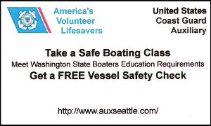 A general purpose Coast Guard Auxiliary card to “Carpet Bomb” your area. The card has “Take a Safe Boating Class”, “Meet Washington State Boaters Education Requirements”, “Get a FREE Vessel Safety Check”, http://www.auxseattle.com/ quick link. There is no personal name on the card. (The pdf file is “Press Quality” and will drive a commercial printing process.)