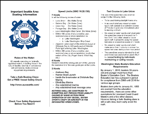 A three fold handout for class, General public handout or use on the boat, Includes Lake Washington, Lake Union and Speed Zones (2 pages) This has vertical lines dividing the columns for easy hand folding. (The pdf file is “Press Quality” and will drive a commercial printing process, pick printer “Flip pages up” if the back page prints upside down.)